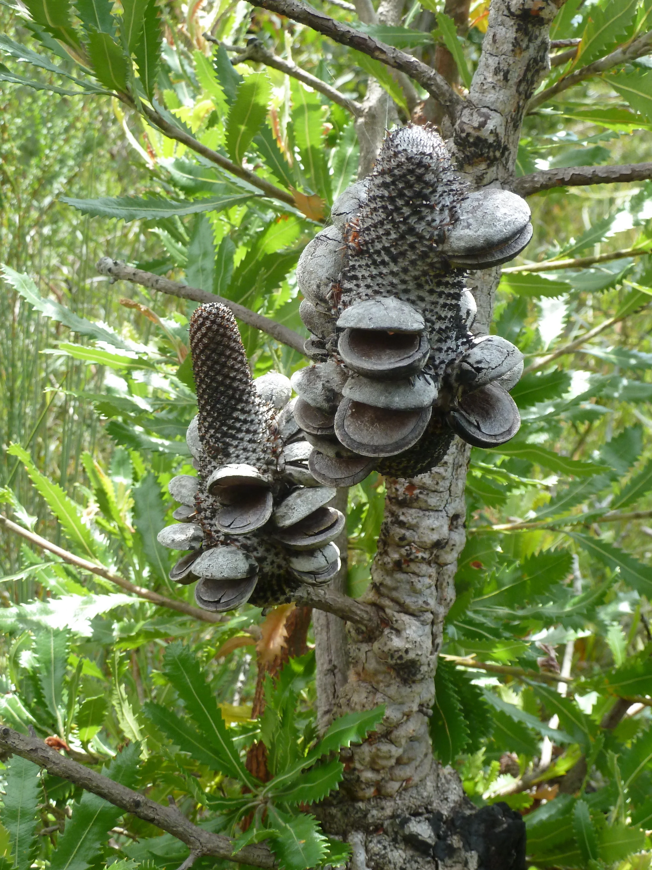 A few kilometres to the west of our house was Rocky Cape National Park, otherwise known as Tangdimmaa. This was an area of great significance in Aboriginal Tasmania: here the Rar.rer.loi.he.ner people lived in sea caves along the rocky shoreline. (I'm glad I'm writing their name and not trying to pronounce it.) There are numerous walking tracks criss-crossing the Park; we only had time for a short one on our last day in the northwest before heading for Cradle Mountain. We chose the Banksia Grove and Caves Circuit for its large stand of Saw (or Saw-tooth) Banksias, distinguished by their serrated leaves and splendid flower spikes. The walk starts from the boat ramp at Sisters Beach, the only place in Tasmania where this tall Banksia grows. There's a steep climb up to coastal heathland but you soon reach the Grove. The seed capsules developing among the mature flowers resembled faces.
