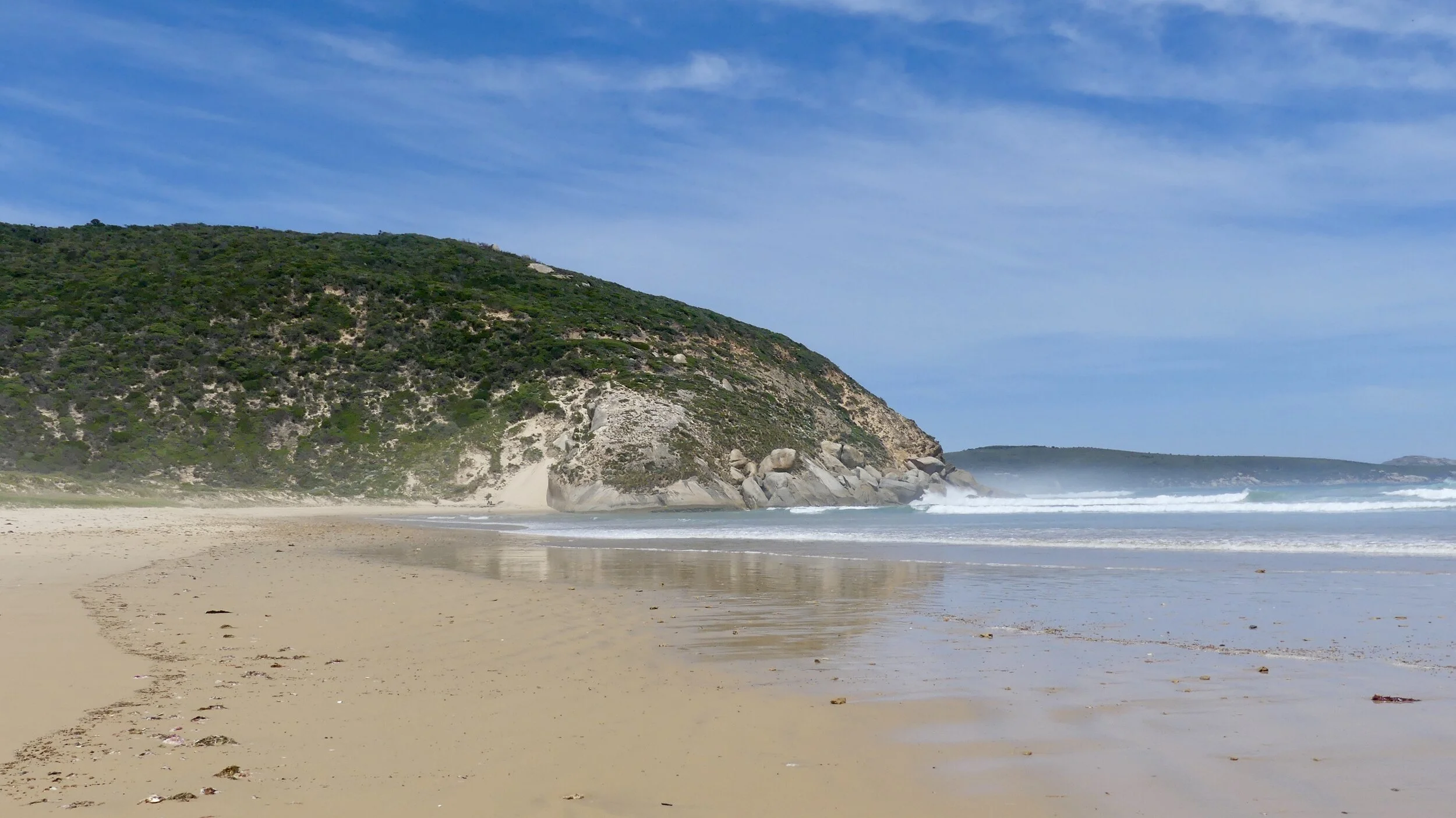 A day or two later we went to Darby Beach, a 1.1-km walk from the car park by Promontory Road where it crosses the Darby River. A sandy track down to the beach follows the River in places. Ye gods, it was hot.