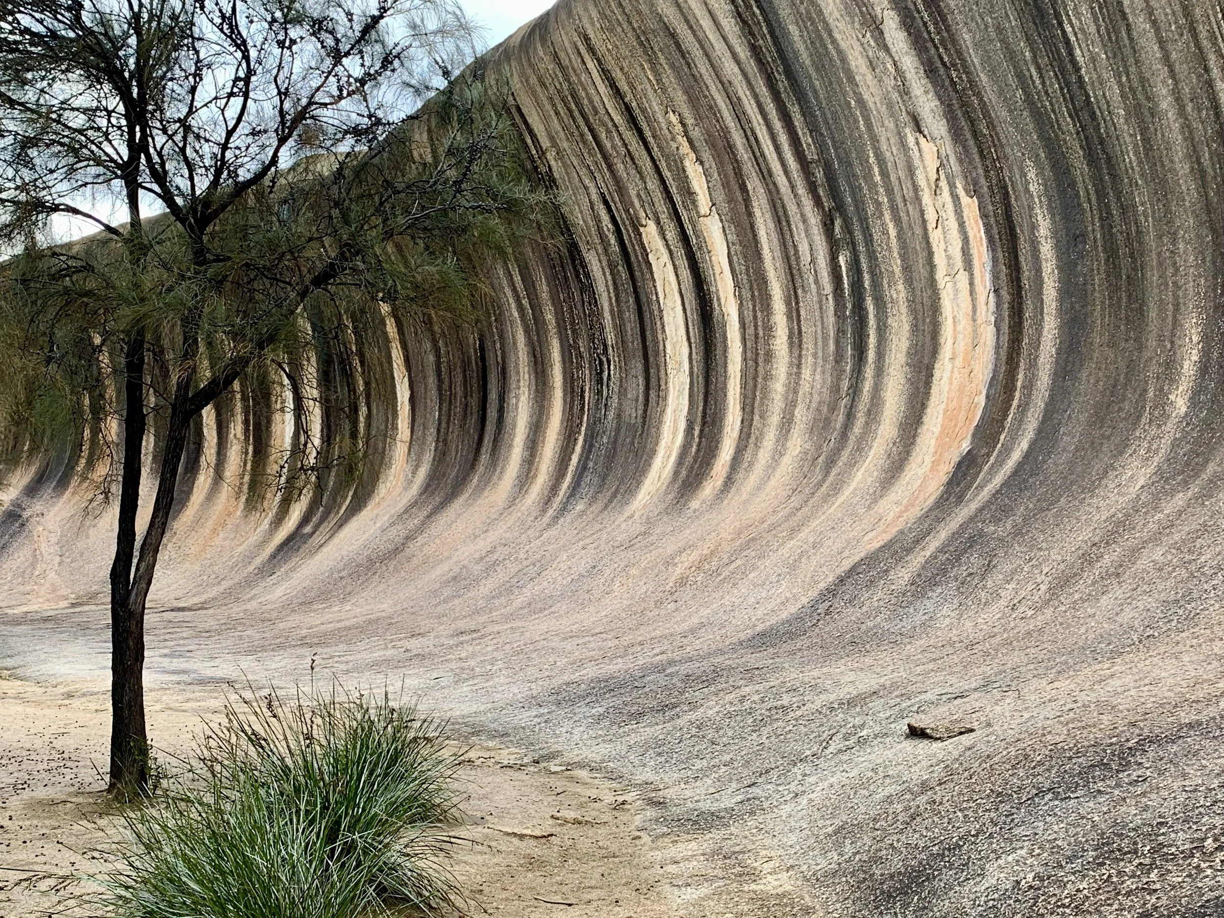 This huge granite cliff is 45 metres high and 110 metres long, and looks for all the world like a wave about to break on shore. The cliff is the northern edge of a much larger structure, Hyden Rock, an inselberg, usually defined as an isolated hill rising above a flat plain. But the massive base structure was underground 60 million years ago, before tectonic and erosive processes imperceptibly lifted and sculpted and eventually revealed.