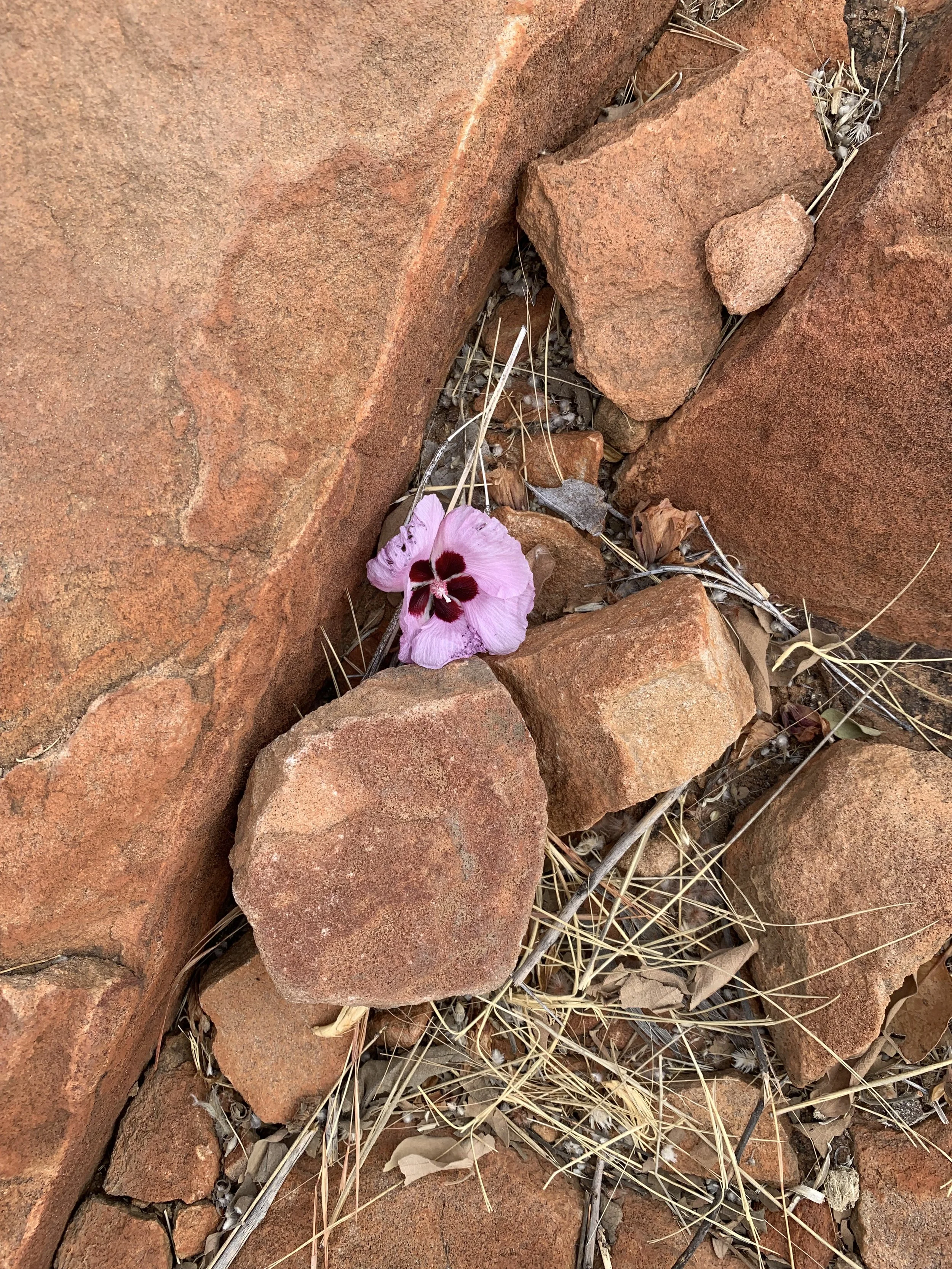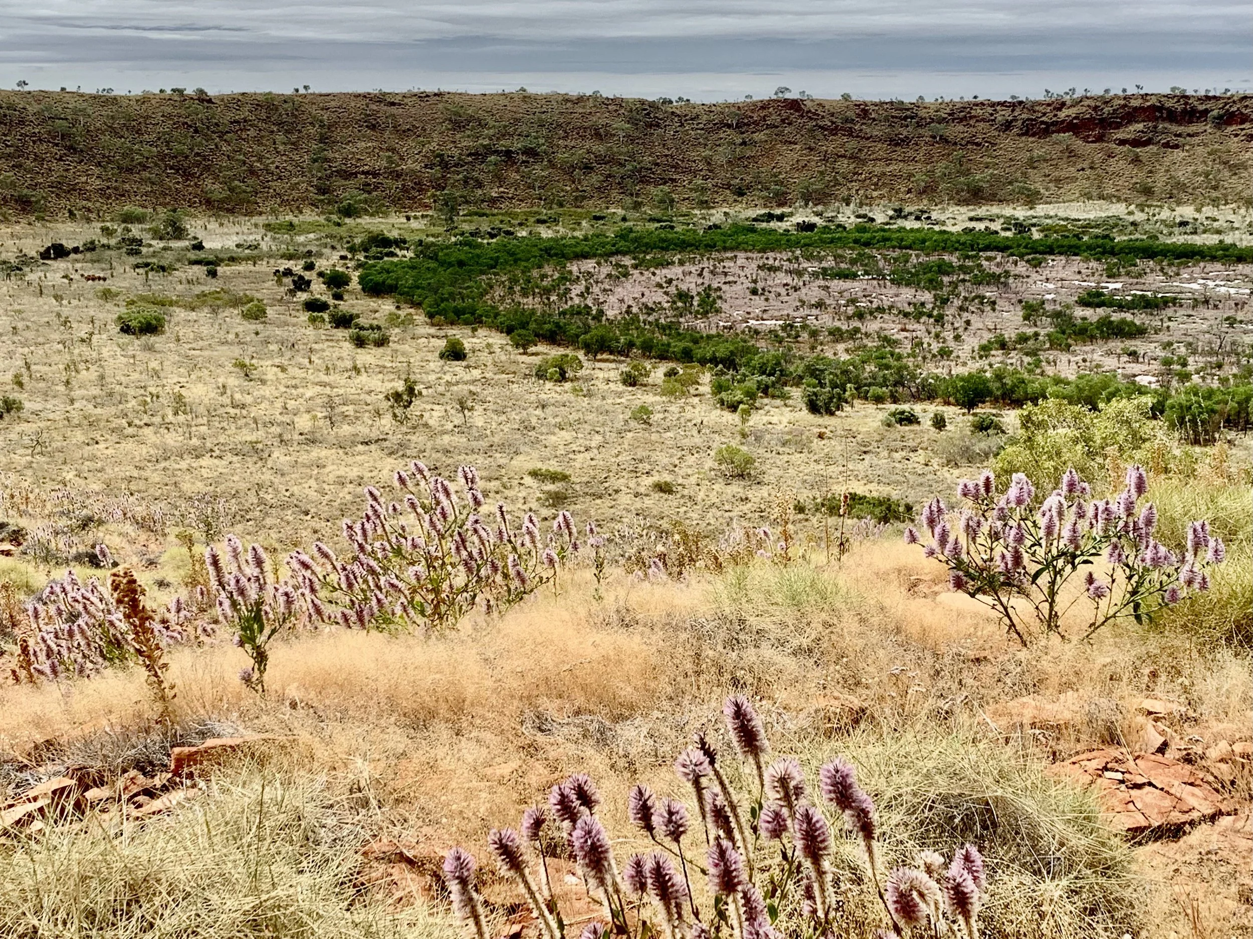 Walking the crater rim was relatively easy and thoroughly enjoyable, with far-reaching views over land beyond the crater rim, and plentiful clumps of pink Mulla Mulla within it.